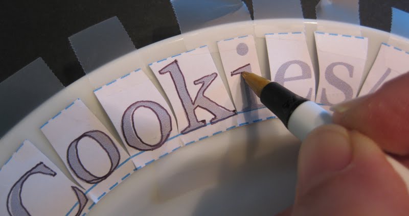 Beginning at the center of the top or the bottom, center your type strip and secure with tape. Fan out type, letter by letter, taping as you go and using the rim of the plate as a guide.