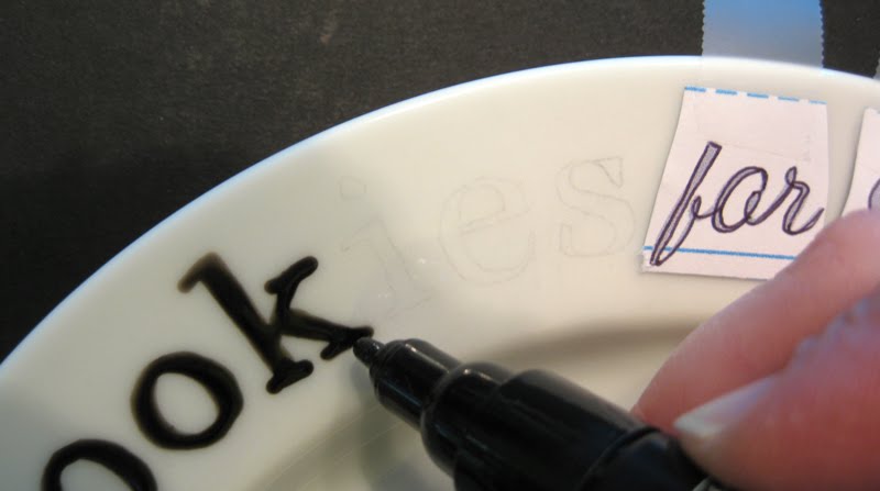 There used to be a paint-your-own-pottery shop in town when my kids were little and for Christmas I made Santa cookie plates for them and a few for friends and family. The shop is no longer around so I created a way to make one using a porcelaine paint pen for ceramics and some old-school type-curving techniques.