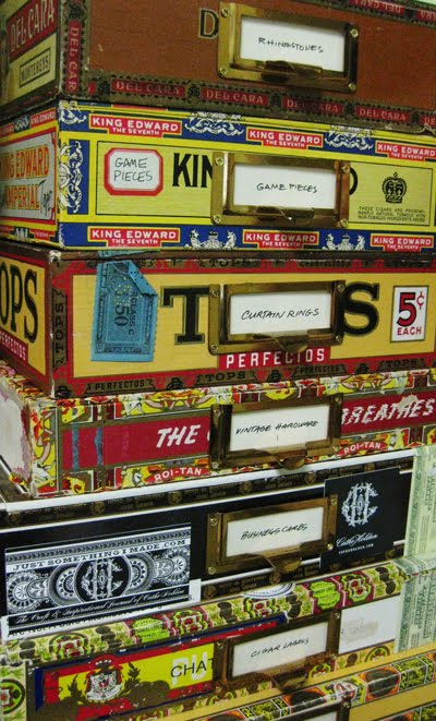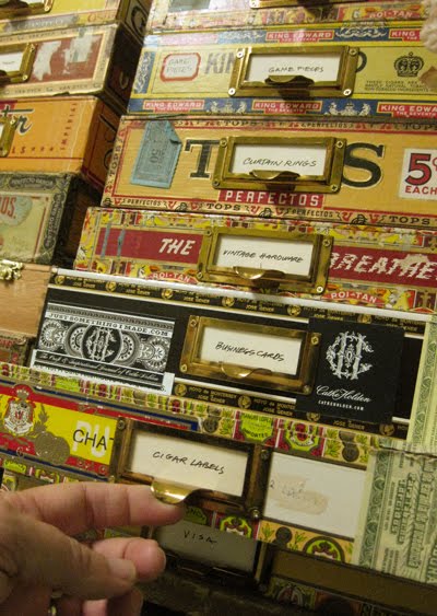 My hook on storing with vintage cigar boxes came the day I found and clipped out an image from a magazine of a large parts cabinet crafted to hold around 36 same size cigar boxes, acting as drawers. It was a bit like this fabulous one, below, that I found for sale on Etsy, but on a much larger scale.