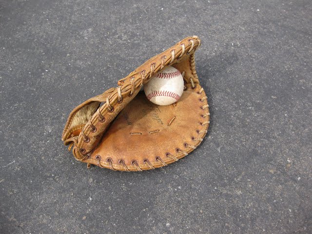 I spent some time trying to come up with just the right shot until my 13 year old daughter, Jamie, and I decided on one special item she cherishes. Her vintage first-baseman’s baseball glove. It’s not just any glove- it’s the one my father gave to his son, my oldest brother, Tom, when he was a young boy. Tom came from Michigan to visit our family a few years ago and met my husband and children for the first time. He brought with him that glove as a gift. Sadly, the following summer Tom died suddenly of heart failure. Jamie, a baseball enthusiast, used that glove in every game she was put on first base. It also was the beginning of her vintage baseball glove collection.