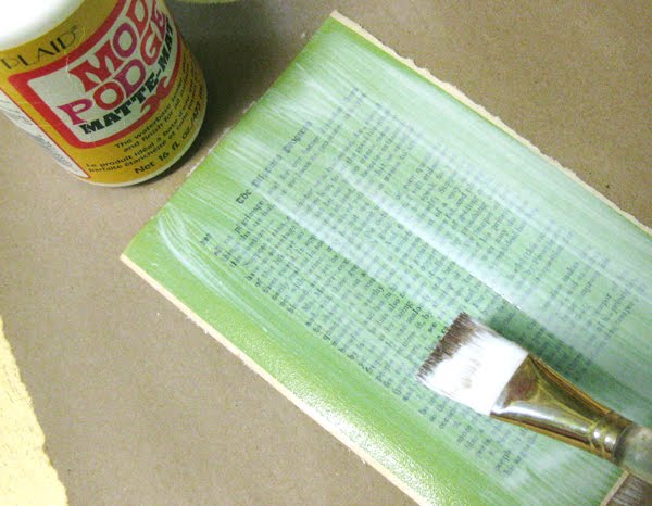 I covered the green page with Matte Modge Podge, and not being the most patient of crafters, dried the page with my hairdryer. The Mod Podge gives the paper a more plastic surface making it much less likely to tear.