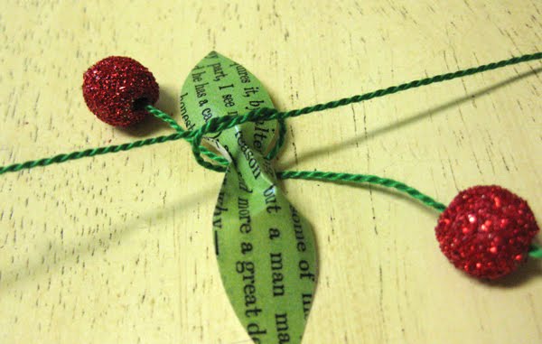 I cinched the leaves in the center and crisscrossed them across the string holding the beads, just a bit off center to allow for one cherry to hang lower than the other. With another length of string I tied the leaves and stems together.
