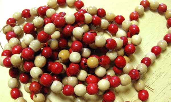 I have this cheap strand of wooden bead holiday garland that I’ve picked apart and used before in other projects, such as threading advent calendar spools, but thought of another cute use for the beads today.
