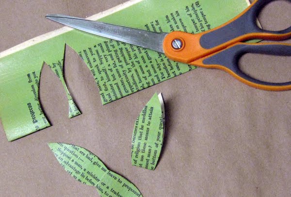 For the cherry leaves, I ran a page from a tattered book through the printer, printing a block of green onto it.