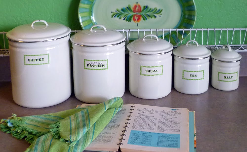 I have so many ideas of ways to use decals that can be custom designed, that I’ll be sharing more than one post over the next few weeks on using the material. Today’s post is for the kitchen- vintage-style kitchen canister decals of which I’ve designed four different sets.