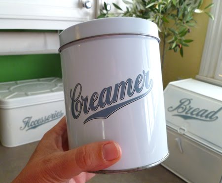 Together with my vintage metal bread box that has seen so many different colors of paint over the years, I spray painted them both white and added decals. I also added coordinating decals to my Splenda and Coffeemate tins purchased at Michael’s Crafts.