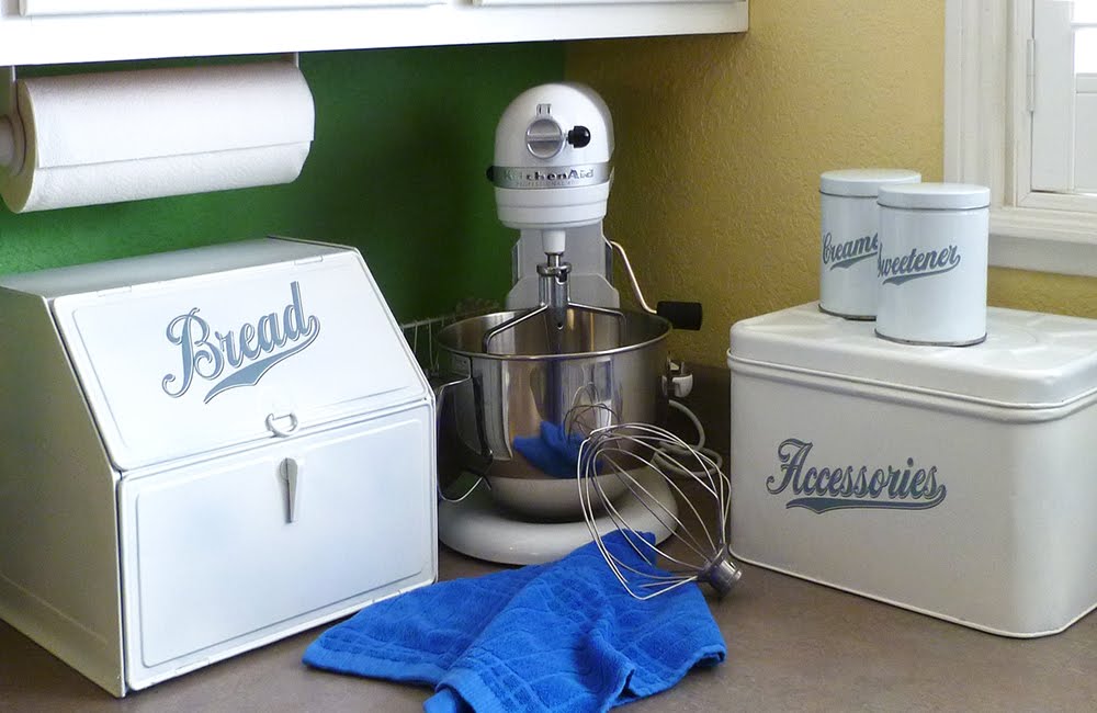 Last week I found this grungy bread box at the thrift store, an oldie and a goodie. With the lettering I designed, I knew it would be the perfect container to hold the KitchenAid mixer accessories.