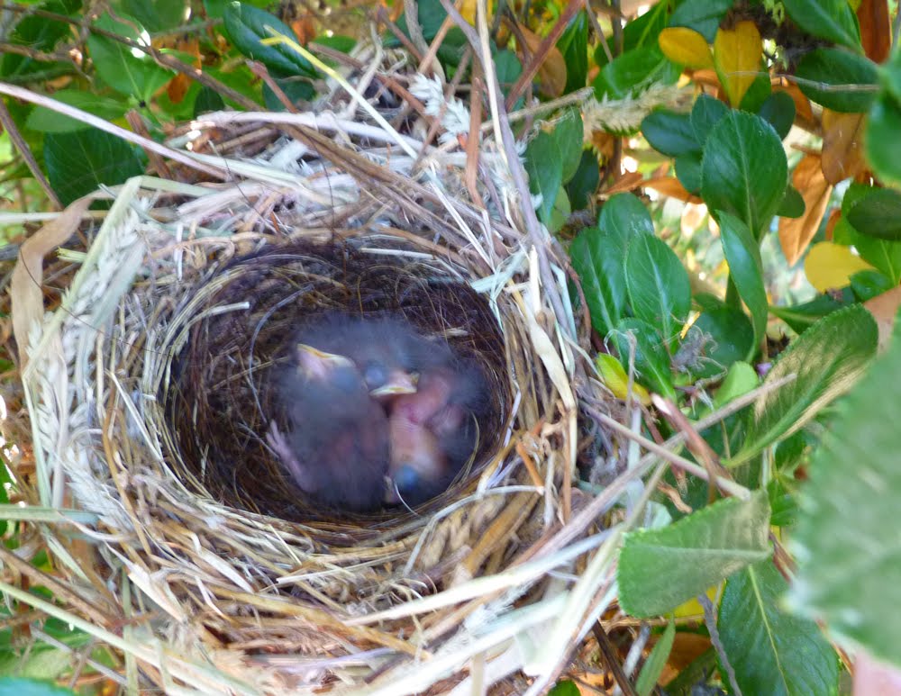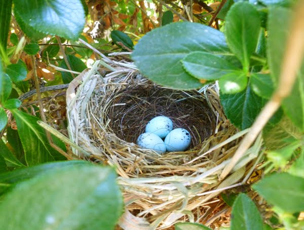 Jeff was out in the yard this afternoon and discovered a beautiful nest of eggs in the boxwood shrubs. He came to my studio window and told me to grab my camera. With mother bird on watch on a nearby branch, I shot a sweet photo of her babies-to-be.
