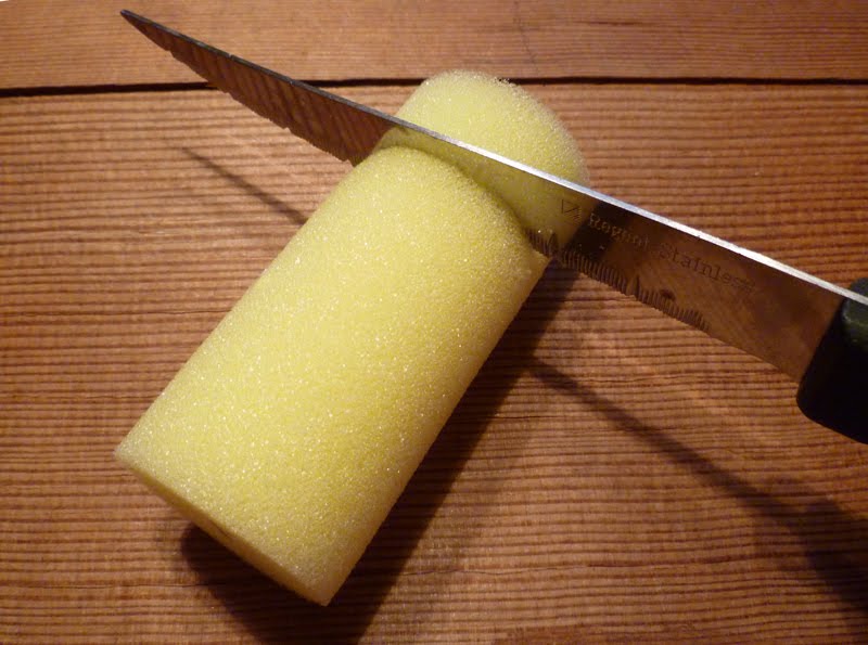 Back home, I used my thrift store steak knife to divide the sponge rollers into sections to fit my tape rolls and popped them into the centers. It is important that each tape roll has its own separate foam roller center as the rolls of tape must be able to turn independent from one another.