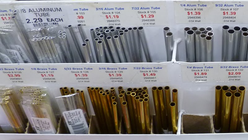 On to finding a dowel to run through the center hole of the foam rollers, I spied a rack of aluminum tubing. Way better than wood as the dowel could ultimately bow from the weight of the tape rolls.