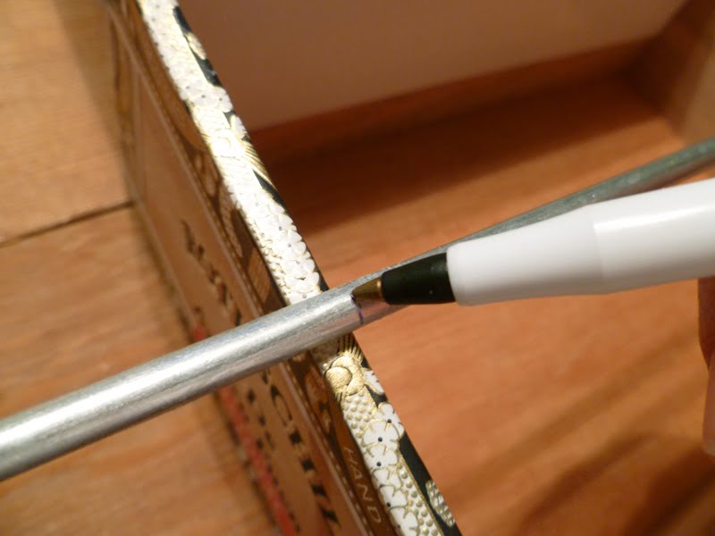 I measured my tubing to the width of the inside of the box and sawed it also with my knife. (Not a knife we use for food, by the way.)Using a new, full roll as a guide for height, I centered it on the side of the box and marked the center hole. (I slid out the narrow ink tube of my ballpoint pen to fit into the hole for marking.) I measured from top and edge to the hole mark and duplicated that on the other side to make the hole for the opposite end of the tubing.